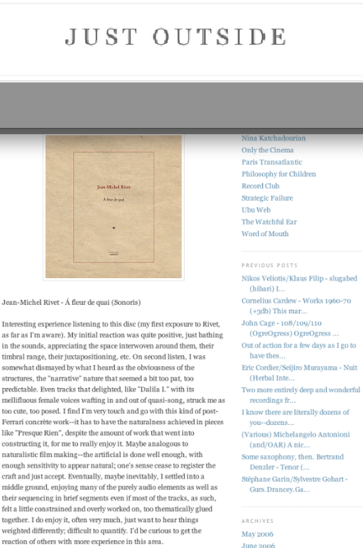 Ces mêmes micros, je les ai installés en lieu et place des petits haut-parleurs de mon casque de baladeur (le phonocasque), je branche à l'autre bout du fil un enregistreur : ainsi j'ai la vraie stéréo toujours avec moi. Je suis comme le photographe qui a toujours un appareil avec lui… : je saisis des instantanés, les mets en album, je les collectionne.